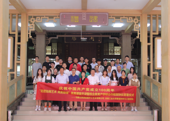 与马鞍山市洪滨丝画手工艺术有限公司校企美育产学研合作框架协议签署仪式在马鞍山中国丝画院隆重举行。马鞍山市人大常委会副秘书长曹化根,中国工艺美术大师、洪滨丝画手工艺术有限公司总经理袁洪滨,车间主任曹业翠、总经理助理黄静芳,数理PG电子官方