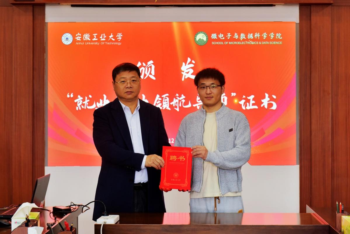 为邹章贵颁发“安徽工业大学就业创业领航导师”证书。