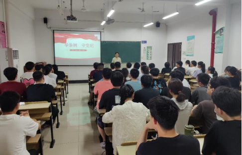 举办党纪学习教育宣讲报告会,第五届辅导员宣讲团成员王小花主讲,全体学生党员参加,会议由院团委书记段世祥主持。