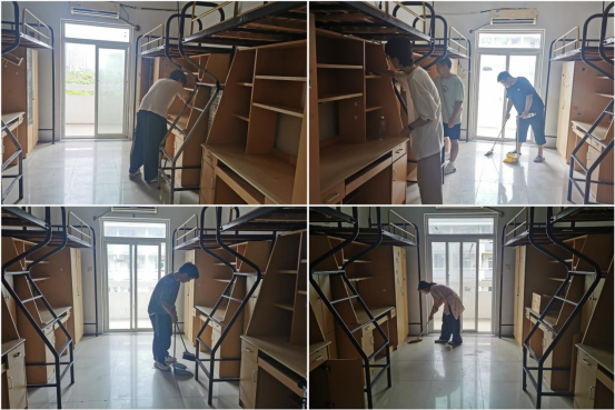 活动现场,老师与志愿者们分工协作,有条不紊地投入清扫工作。他们手持工具,仔细清理宿舍地面的灰尘与杂物,弯腰擦拭床铺框架、书桌及衣柜,不放过任何卫生死角。同时,还对宿舍水电、门、窗、桌椅进行了全面排查并做好记录及时上报。在确保新生宿舍的干净整洁后,志愿者们有序关门离场。