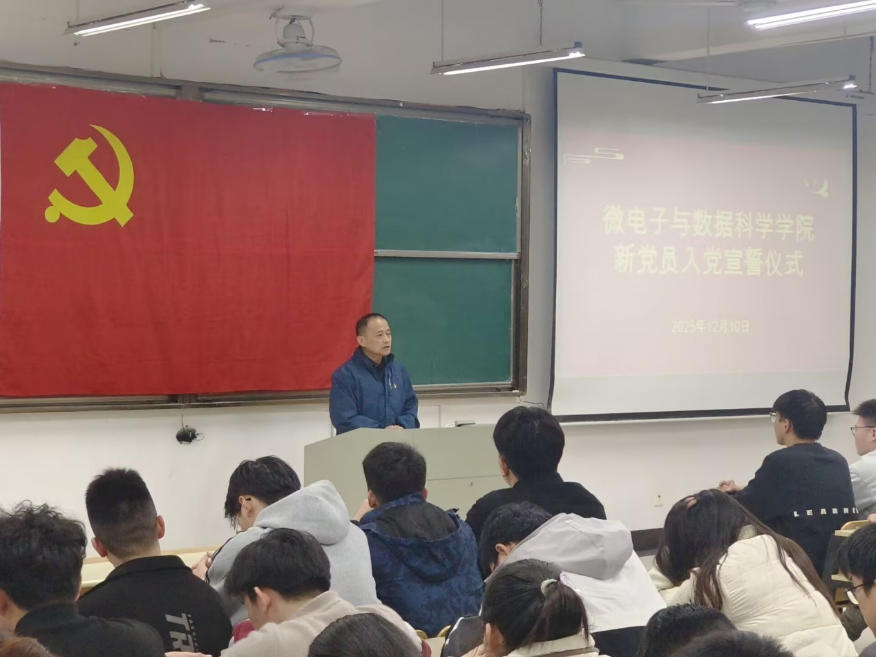 党委关于党员发展和转正的批复。随后,汪春胜及各学生支部书记为新发展的预备党员佩戴党员徽章。全体新党员和老党员面向党旗庄严宣誓,誓言铿锵有力,表达了党员们对党的忠诚和为人民服务的决心。大数据本科生党支部陈璇作为新党员代表发言,郑重承诺用实际行动践行初心使命。微电子本科生党支部刘文杰作为老党员代表发言,对新党员予以祝贺,结合自身经历分享了入党后的成长感悟。