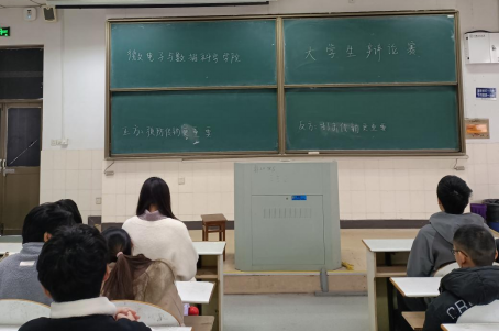 在阶梯教室302举办反传销专题辩论赛,21级辅导员张佳良担任评委。