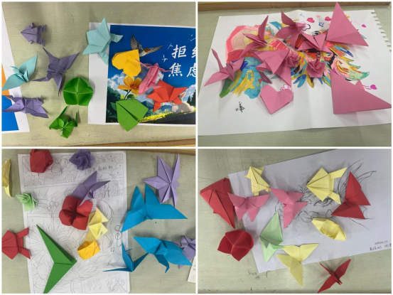 活动现场准备了颜色各异的折纸,还有白纸供学生绘画。现场的“艺术家们”全神贯注地将折纸排列组合,构思出独一无二的形状。在成果展示环节,各小组呈现了丰富多彩的手工作品。灵动的千纸鹤、精致的爱心折纸、充满想象的绘画作品等等,每一件作品都承载着团队的巧思与情感。同学们在分享创作心得时表示,手工制作不仅带来成就感,更让他们在专注创作的过程中感受到内心的平静与快乐。
