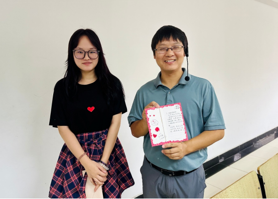 课堂上,同学们将亲手制作的贺卡郑重地递到老师手中,并附上一个温暖的拥抱或深深的鞠躬礼。这份不期而至的小惊喜,联结着师生的温情。数据科学与大数据技术专业系主任杨辉老师摩挲着精致的贺卡,爱不释手,“收到贺卡的那一刻,惊喜又温暖!看到孩子们懂得感恩、不断成长,就是我们作为老师最好的回报。”辅导员张佳良表示:“一封手写贺卡不仅是传统文化的传承,更能让学生学会表达感恩、懂得尊重。我们希望通过这样的活动,构建更有温度的师生关系,落实立德树人根本任务。”