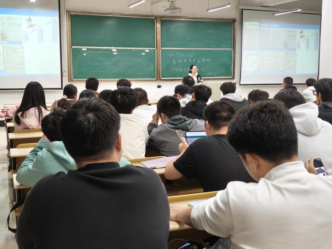 关工委与学生工作办公室联合举办“唯实”学生成长成才论坛(第五期)。论坛邀请2022级光电信息科学与工程专业两位优秀学子王善美和王超主讲,2025级光电专业学生参加,辅导员周文潇主持。